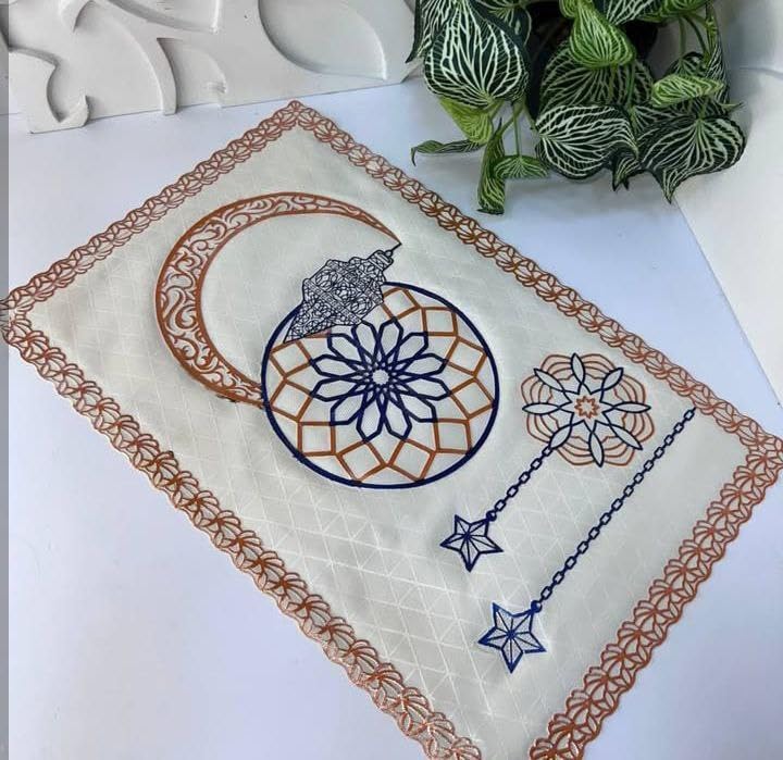 - تصميم أنيق: تتميز بنقشات هندسية معقدة مع زخارف قمر وماندالا ونجوم بألوان كحلي ونحاسية، مؤطرة بحواف مزخرفة لتزيين الطاولة.