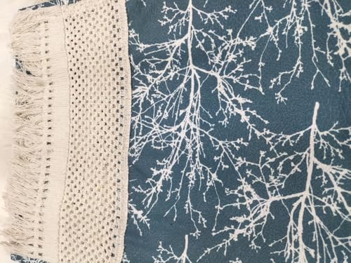 - تصميم أنيق: قماش أزرق مخضر مع نمط فرع أبيض رقيق، مزين بتفاصيل شراشيب مكرمية مصنوعة يدويًا لمظهر راقي.