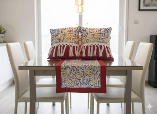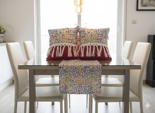 - مجموعة كاملة من 3 قطع: تتضمن مفرش طاولة مزخرف مع تفاصيل شراشيب وغطائي وسادة متطابقين يتميزان بنمط تجريدي نابض بالحياة متعدد الألوان