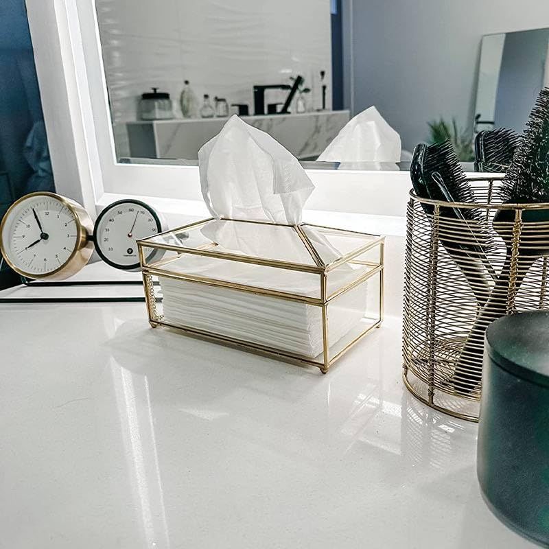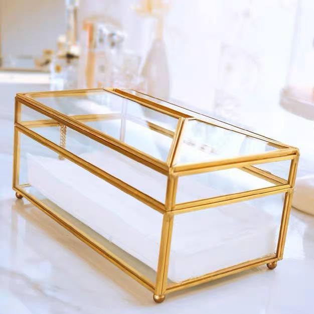 Generic - جيني حامل علبة مناديل مزخرف، زجاج شفاف مع اطار معدني ذهبي، منظم تخزين مستطيل من سوه