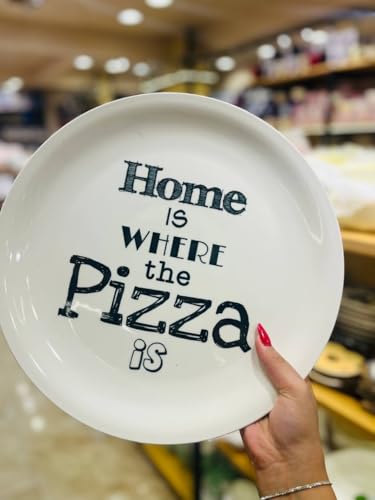 - مزايا التصميم: طبق بورسلين أبيض أنيق يتميز بتصميم مطبوع "Home is where the Pizza is" المرح، مثالي لإعداد الطعام بأسلوب عصري.