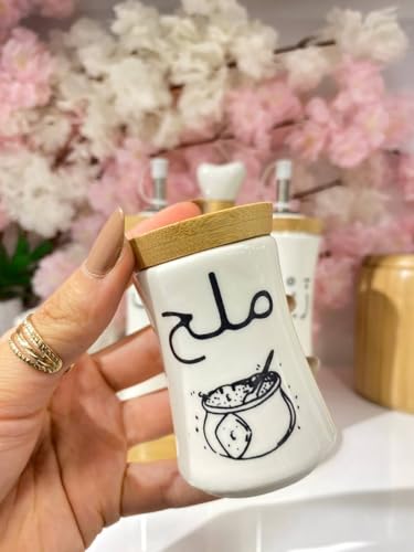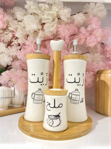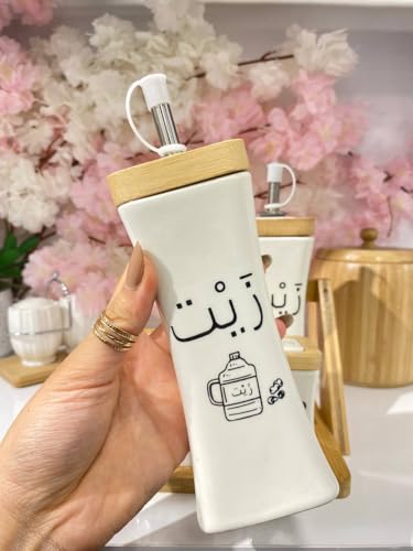 - تصميم أنيق: موزعات من البورسلين الأبيض مزينة بطباعات الخط العربي مع لمسات ذهبية من الخيزران، لتضفي لمسة راقية على ديكور المطبخ.