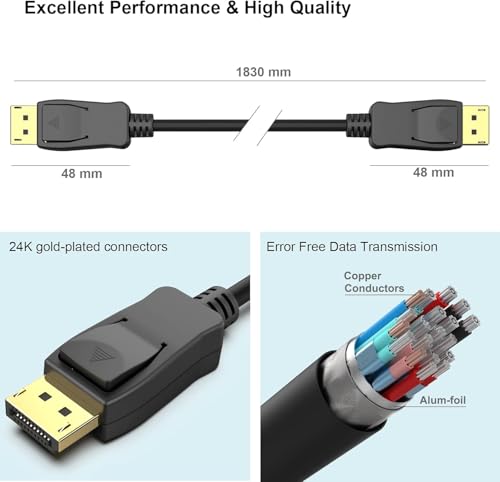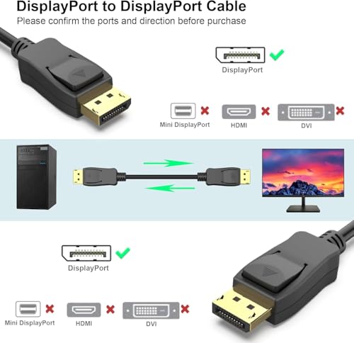 - جيني كيبل منفذ عرض إلى منفذ عرض بطول 1.8 متر، كيبل DP إلى DP ذكر إلى ذكر، سلك مطلي بالذهب، يدعم 4K60Hz، 2K144Hz متوافق مع لينوفو وديل واتش بي واسوس