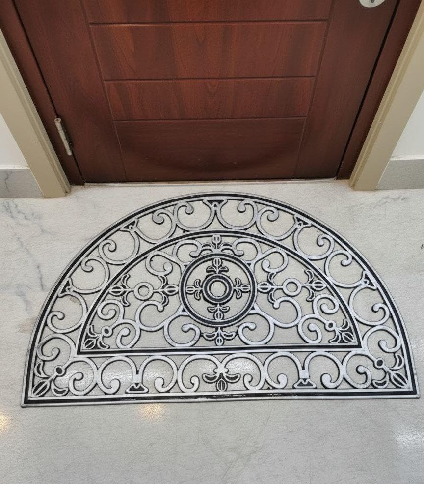 - تصميم أنيق: دواسة باب على شكل نصف قمر تتميز بأنماط الزهور المعقدة والتمرير في نظام ألوان أسود وأبيض متطور