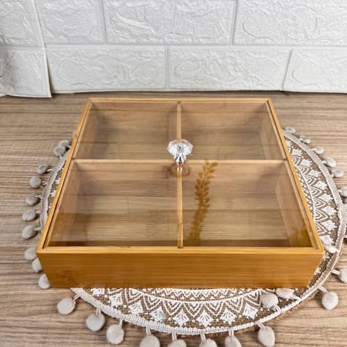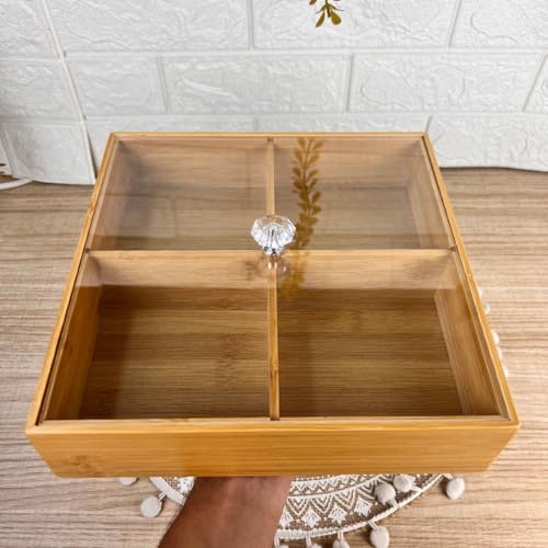 Generic - جيني صندوق تخزين انيق من الخيزران مع غطاء زجاجي، منظم 4 مقصورات، حافظة عرض من الخشب الطبيعي للشاي والتوابل والاكسسوارات، كريستال