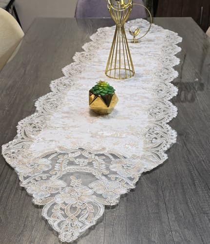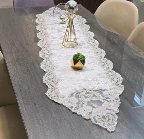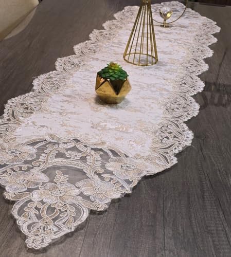 Generic - جيني مفرش طاولة انيق من الدانتيل، نمط زهور بيضاء، تصميم تركي ممتاز، 200 × 45 سم، حافة صدفية، ديكور غرفة الطعام