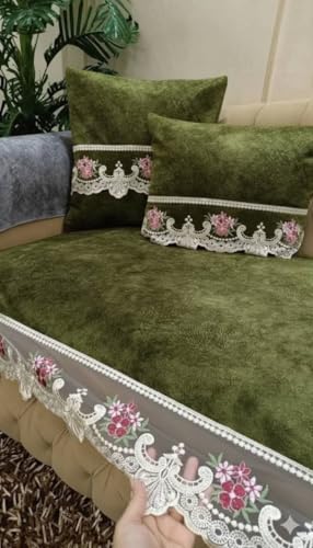 Generic - طقم كنبة قطيفة أنيقة لغرفة المعيشة مع حواف دانتيل بنمط زهور مكونة من كنبة كبيرة 1.8 م × 80 سم وكنبة صغيرة 1.6 م × 80 سم و2 كرسي و6 مخدات، 10 قطع، أخضر زيتوني
