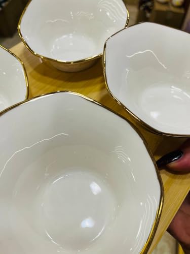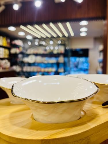 - تصميم أنيق: أطباق عميقة بورسلين بيضاء تتميز بزخارف ذهبية فاخرة حول الحواف، مثالية لرفع مستوى تناول الطعام الخاص بك.