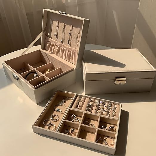 - تصميم واسع مزدوج الطبقات - يتميز بطبقتين مع مساحات تخزين متعددة للخواتم والأقراط والقلائد والأساور.