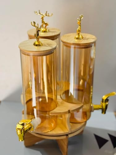 - تصميم أنيق: موزع مشروبات زجاجي ثلاثي الأقسام يتميز بغطاء بتصميم غزال ذهبي مزخرف وحامل قاعدة خشبية فاخرة لتقديم طعام راقي.