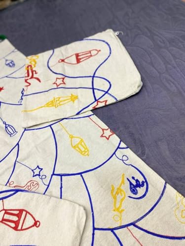 - تصميم عربي مزخرف: يتميز بنمط مطرز ساحر متعدد الألوان يحتوي على فوانيس عربية تقليدية ونجوم وممرات متعرجة على خلفية بلون كريمي، مما يضفي لمسة من الأناقة التراثية إلى أي مكان.