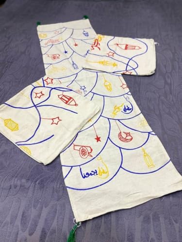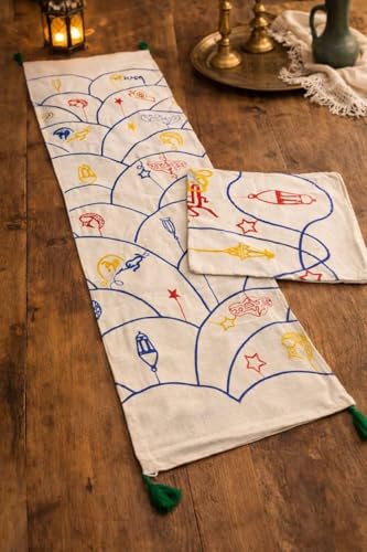 Generic - مفرش طاولة مطرز بلون كريمي مع شراشيب بلون أخضر وأكياس مخدات بتصميم فانوس عربي متعددة الألوان، مقاس المفرش 1.35 م× 40 سم، وكيسين مخدة مقاس 45 × 45 سم، طقم من 3 قطع