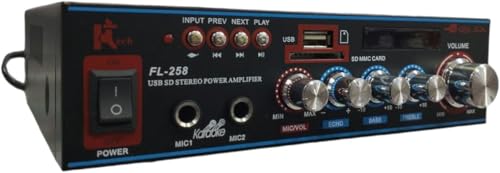 - مضخم صوت من جي ام FL-258 بصوت ستيريو نظام هاي فاي مع مدخل USB واس دي وميكروفون وصوت باس، ثلاثي التحكم في ايكو تون