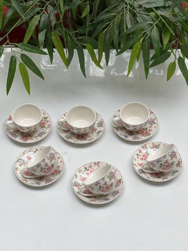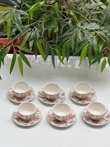Generic - جيني طقم فناجين شاي وصحون من البورسلين بتصميم زهور، ابيض كلاسيكي مع نمط وردة وردية، 12 قطعة لتقديم القهوة (6 اكواب، 6 صحون)