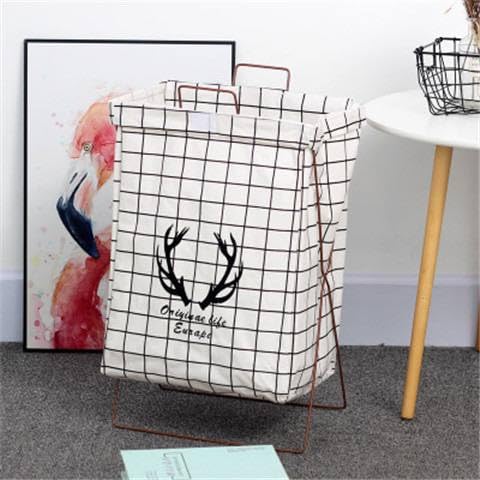 - التصميم: سبت تخزين قماشي أنيق بنمط شبكي مع طباعة على شكل قرن الغزال وحامل إطار معدني من أجل الثبات والدعم.