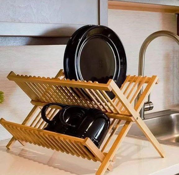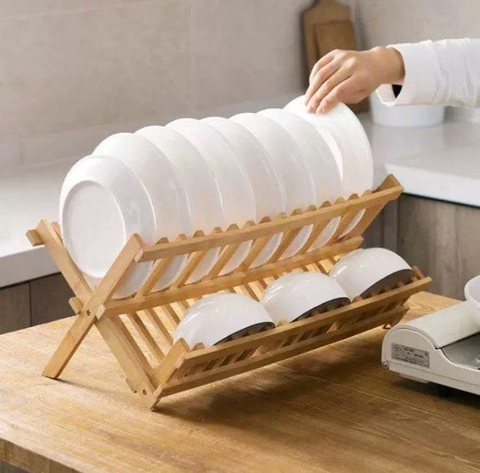 - تصميم موفر للمساحة: رف أطباق بتصميم قابل للطي من مستويين يمكن طيه بشكل مسطح لتوفير سهولة التخزين، ما يجعله مثاليًا لزيادة مساحة الطاولة في المطابخ الصغيرة.