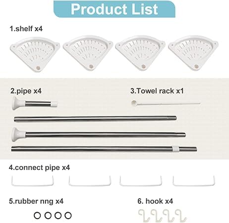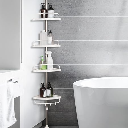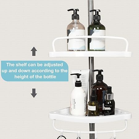 - مساحة تنظيم كبيرة: يحتوي حامل أدوات الاستحمام على 4 أرفف كبيرة، يمكن لكل رف حمل 4-5 زجاجات. يمكن لحامل أدوات الاستحمام حمل أكسسوارات الحمام مثل زجاجات الشامبو وغسول الجسم وغير ذلك الكثير. الرف المتين من بلاستيك