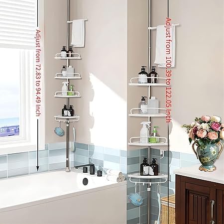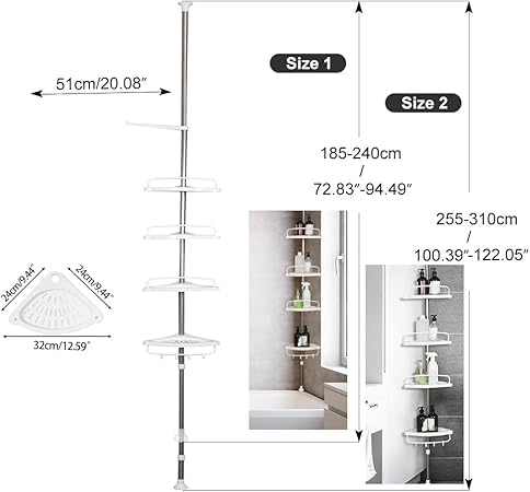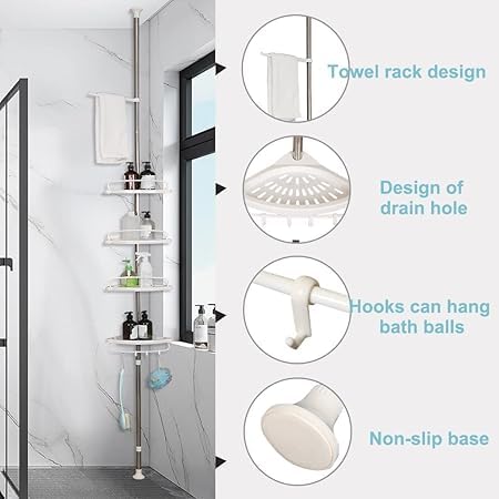 - فولاذ مقاوم للصدأ: صُنع عمود شد حامل أدوات الاستحمام من قضبان من الفولاذ المقاوم للصدأ 304 الفاخر وصينية بلاستيكية عميقة متينة تمنع الصدأ