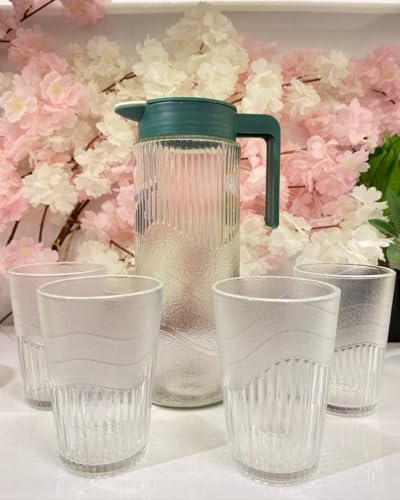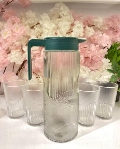 - مجموعة كاملة: إبريق زجاجي عصري بغطاء أخضر و4 أكواب شرب متطابقة، مثالي لتقديم الماء أو العصير أو المشروبات الأخرى