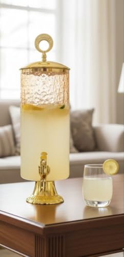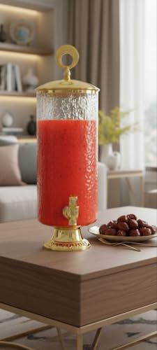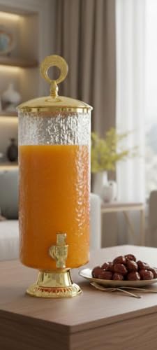 - تصميم أنيق: يتميز موزع المشروبات الزجاجي بلون العسل بقاعدة ذهبية متطورة وغطاء بمقبض زخرفي، مما يضيف لمسة أنيقة وفاخرة إلى طاولة الطعام أو إعداد البوفيه