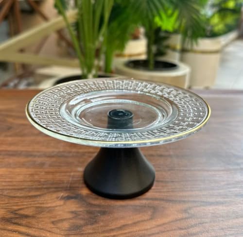 - تصميم أنيق: يتميز حامل الكيك الزجاجي بتصميم عصري مع حواف ذهبية وقاعدة بلاستيكية سوداء متينة، مثالي لعرض الحلويات.