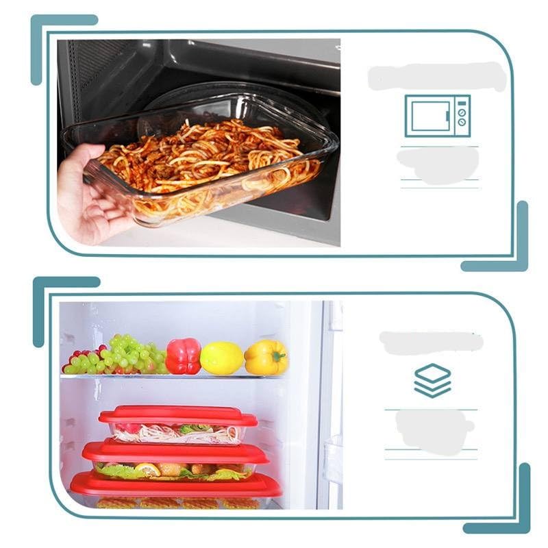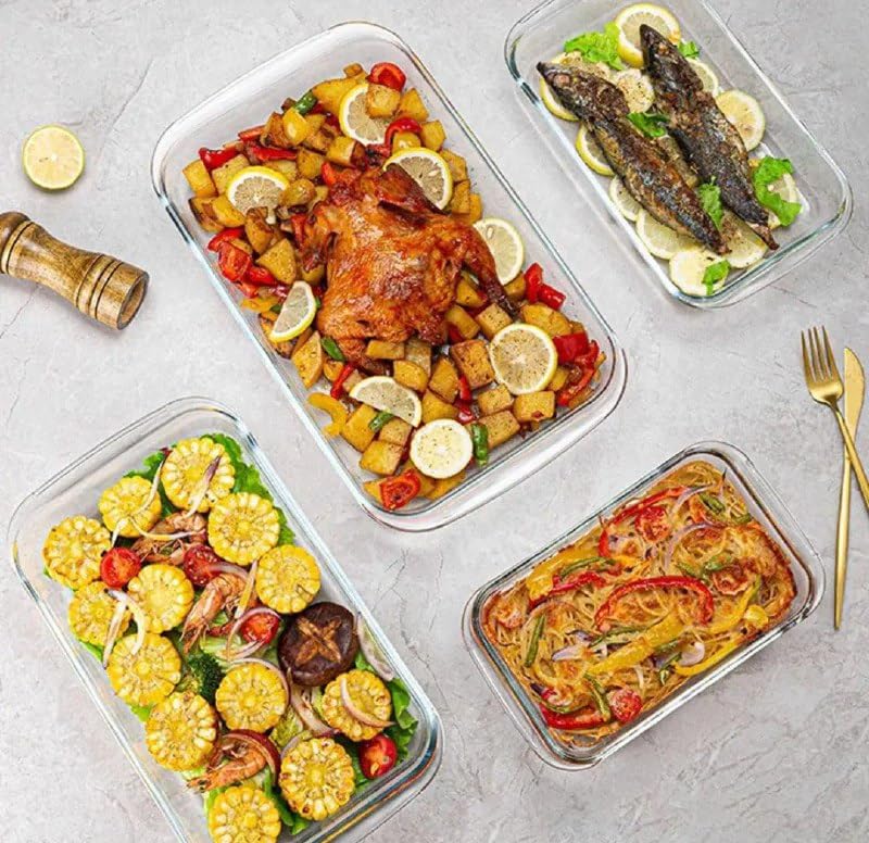 - تصميم عملي: أطباق مستطيلة الشكل مع أغطية ملائمة آمنة مثالية للطهي وتخزين بقايا الطعام في الثلاجة