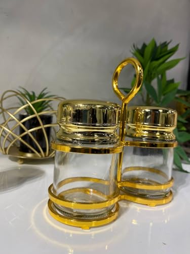 Generic - جيني طقم تقديم بهارات زجاجية مع حامل ذهبي، قطعتان، ديكور انيق لطاولة الطعام (ذهبي)