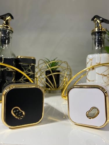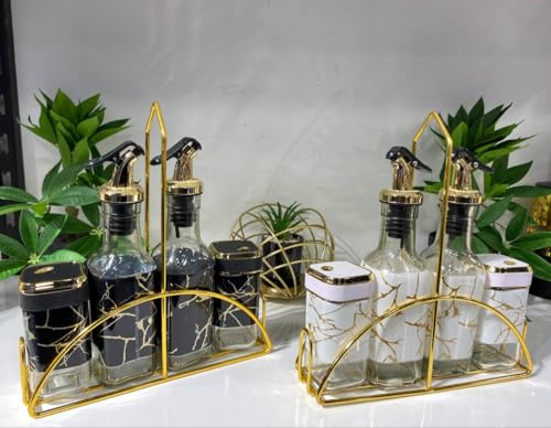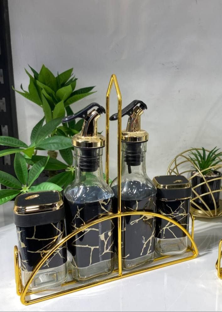 - تصميم أنيق: تتميز موزعات الزجاج وبرطمان التخزين بنمط فرع متطور باللون الذهبي، يكمله حامل معدني بلون ذهبي مطابق
