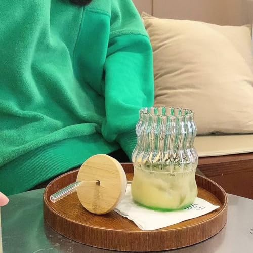 Generic - كوب شرب زجاجي بتصميم مضلع ثلاثي بغطاء خشبي وشفاطة، 420 ملليلتر