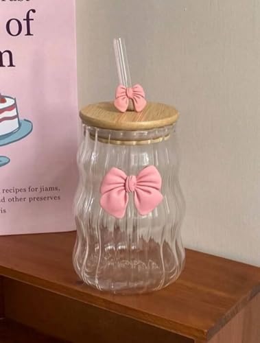 Generic - كوب زجاجي للشرب مع زينة بفيونكة وردية وغطاء خشبي وشفاطة، لون شفاف، مقاس لارج