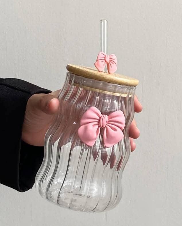 - تصميم ساحر: يتميز بزينة بفيونكة وردية لطيفة على كل من الكوب الزجاجي والشفاطة، مما يضيف لمسة أنثوية ورقيقة إلى مجموعة أواني الشرب الخاصة بكِ.