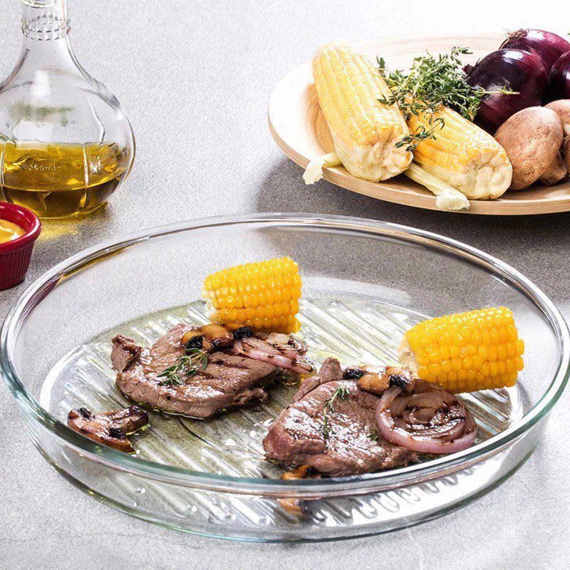- الأبعاد: طبق شواء زجاجي دائري كبير بقطر 30 سم، مثالي لتقديم الأطباق المختلفة وشويها