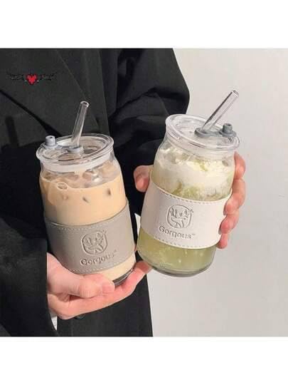 Generic - جيني كوب زجاجي ماسون مع ماصة، سعة 500 مل، مقاوم للحرارة، مقبض جلدي