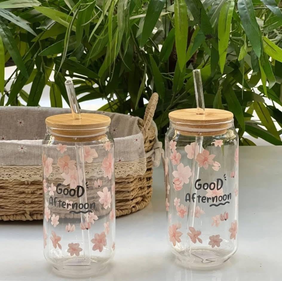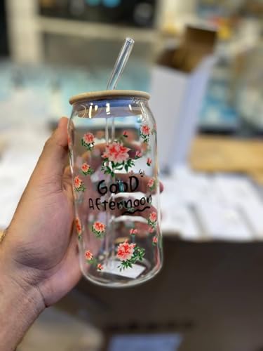 - ميزات التصميم: كوب جميل على شكل برطمان ماسون مع نمط زهور وردية رقيقة ونص "Good Afternoon"، مثالي للمشروبات اليومية