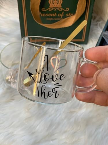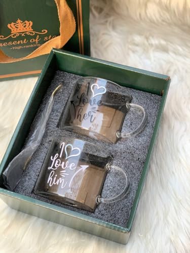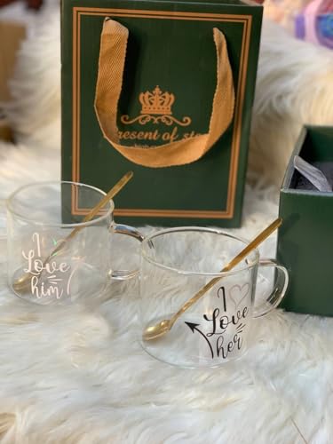 - مجموعة هدايا أنيقة: مجموعة أكواب زجاجية فاخرة تتميز بكوبين مصممين بشكل جميل مع نقوش "Love Him/Her"، مثالية للأزواج والمناسبات الخاصة