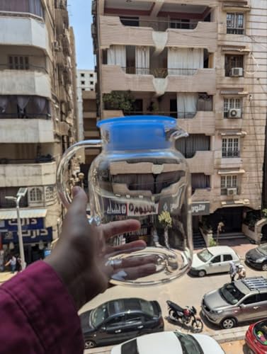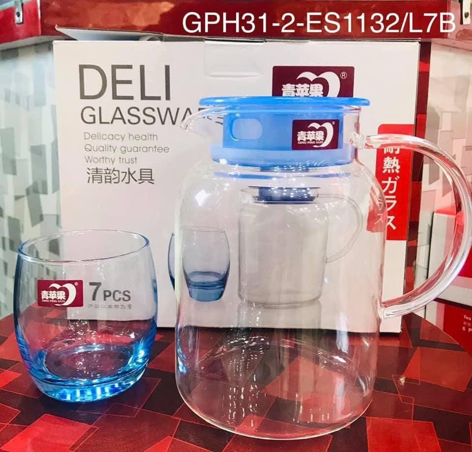- طقم بريميوم: طقم أواني زجاجية كامل يتميز بشفشق سعة 1.5 لتر و 4 أكواب عصير متطابقة بتصميم أنيق ملون بالأزرق.
