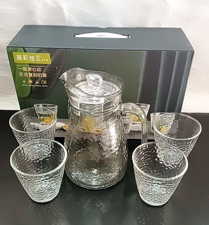 - محتويات الطقم: تتضمن مجموعة الأواني الزجاجية الكاملة شفشق أنيق وأربعة أكواب مطابقة بتصميم بنمط مطروق.