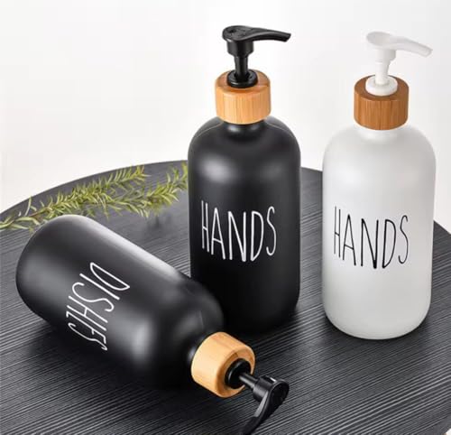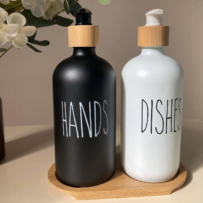 - هيكل من الزجاج الفاخر: طقم موزع صابون يشتمل على زجاجتين أنيقتين من الزجاج البلوري، إحداهما سوداء تحمل ملصق "HANDS" والأخرى بيضاء تحمل ملصق "DISHES" لسهولة التمييز بين صابون اليدين وصابون الأطباق.