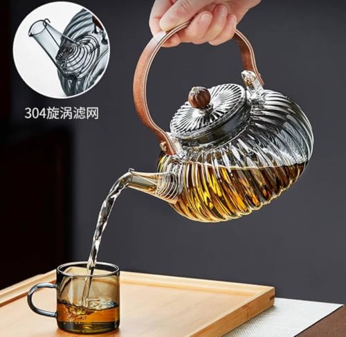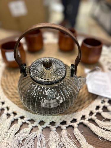 Generic - إبريق شاي زجاجي بتصميم منقوش مقاوم للحرارة بمقبض خشبي وحامل تدفئة