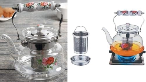 Generic - جيني ابريق شاي زجاجي بمقبض من السيراميك، سعة 1400 مل، بتصميم زهور برتقالية، مصفاة ستانلس ستيل