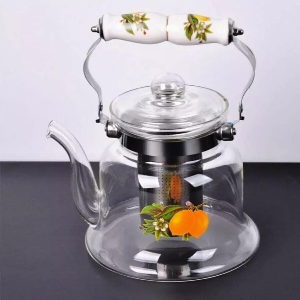 - السعة: إبريق شاي زجاجي كبير سعة 1400 مل مثالي لتقديم أكواب متعددة، يتميز بتصميم زهور برتقالية أنيقة على زجاج بايركس الشفاف