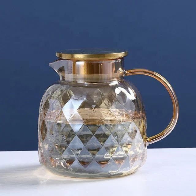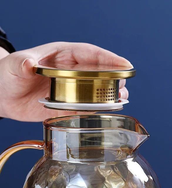 - تصميم فاخر: براد شاي زجاجي أنيق يتميز بنمط ماسي مميز وغطاء ذهبي فاخر، مثالي لمناسبات تقديم الشاي الكاجوال والرسمية.