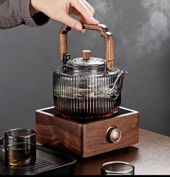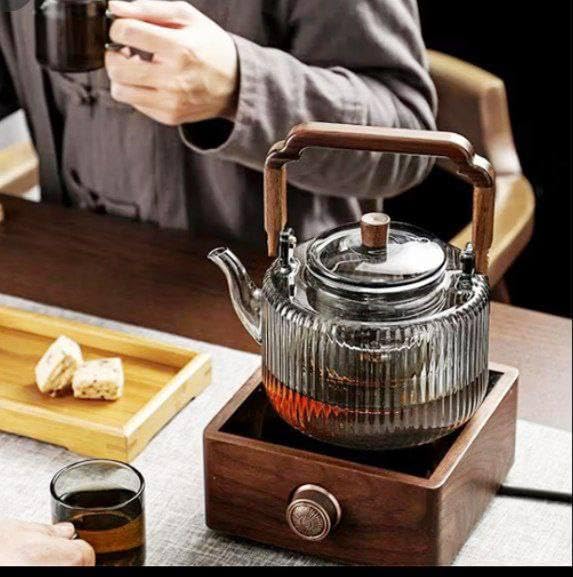 Generic - إبريق شاي زجاجي بمقبض خشبي وقاعدة تسخين بتصميم مضلع من جينيرك، 1.2 لتر
