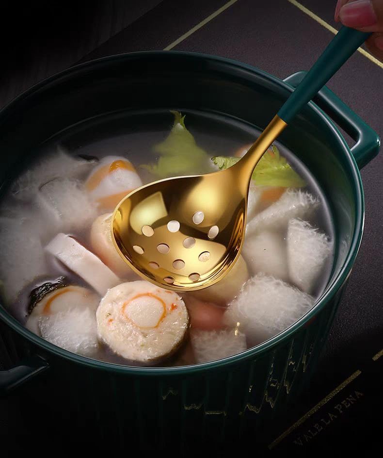 - تصميم متعدد الاستخدامات: تصميم وعاء مثقوب يجعله مثاليًا لتقديم الحساء واليخنات ومكونات الأواني الساخنة وإزالة الرغوة من المرق بسهولة