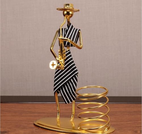 - تصميم أنيق: قطعة زخرفية أنيقة تتميز بشخصية ترتدي فستان مخطط مع لمسة نهائية معدنية ذهبية اللون، مثالية لإضافة الرقي إلى أي مساحة.