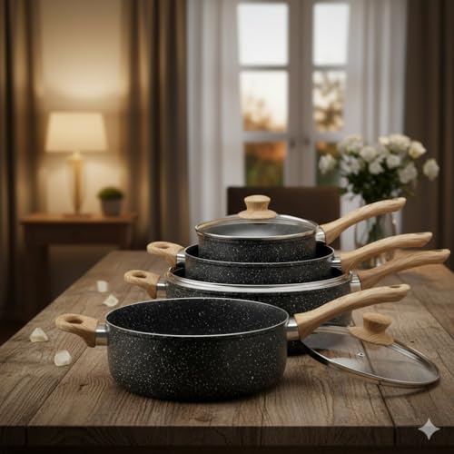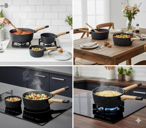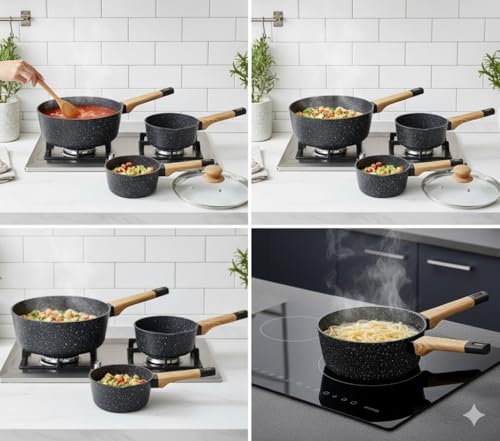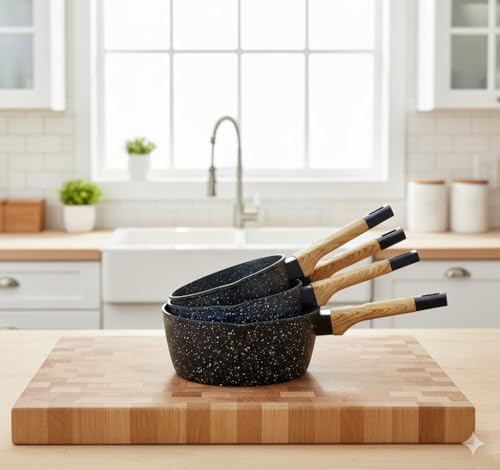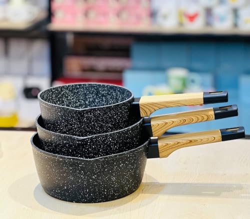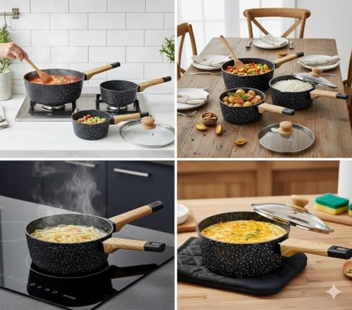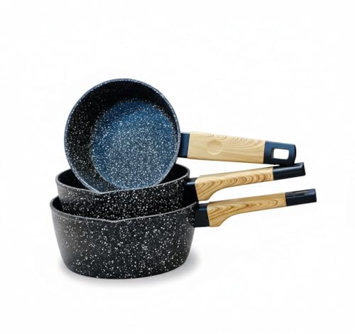 - مجموعة متعددة الاستخدامات: طقم كسرولة مطلي بالجرانيت من ثلاث قطع بمقابض ذات مظهر خشبي، مثالي للطهي وتقديم الأطباق المختلفة من الموقد إلى الطاولة.
