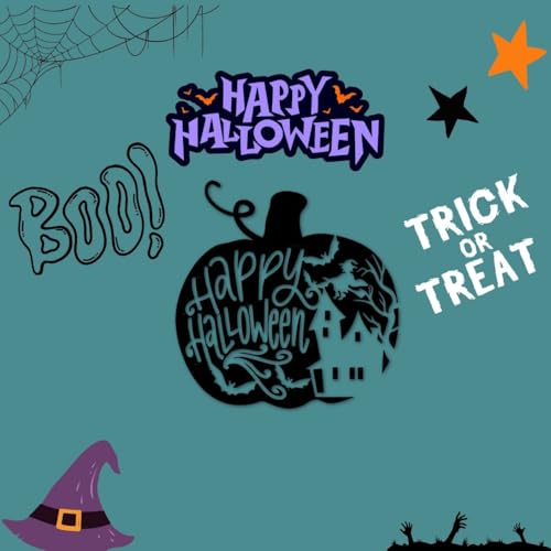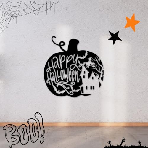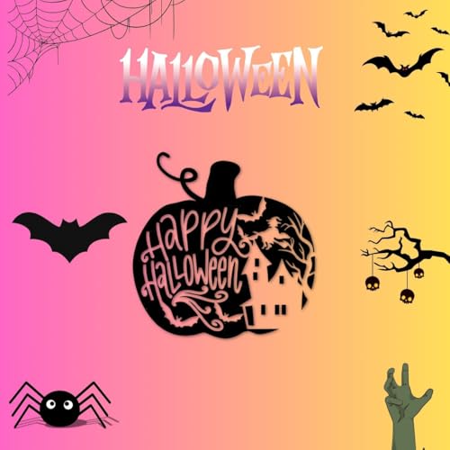 - ديكور الحائط: تصميم صورة ظلية مذهلة يتميز بتصميم يقطين الهالوين مع زخرفة منزل مسكون وخفافيش طائرة، مثالية للديكور الموسمي