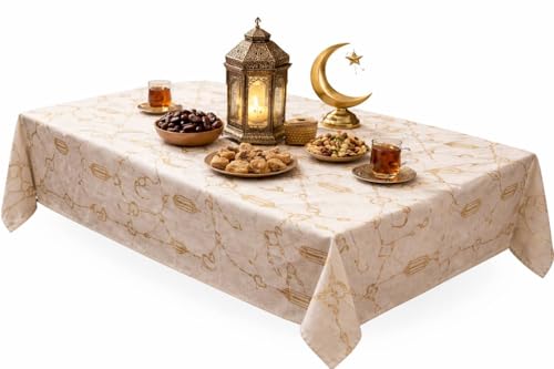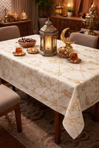 - خامة ممتازة: مصنوع من قماش الكتان الثقيل مع تطريز ذهبي أنيق يتميز بزخارف الفوانيس والهلال التقليدية، مثالي لإضافة لمسة فاخرة إلى طاولة الطعام الخاصة بك