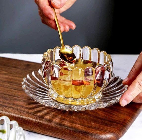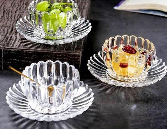 - تصميم أنيق: يتميز هذا الطقم بتصميم زجاجي أنيق ومتطور، مثالي لتقديم الحلويات والآيس كريم والمكسرات.