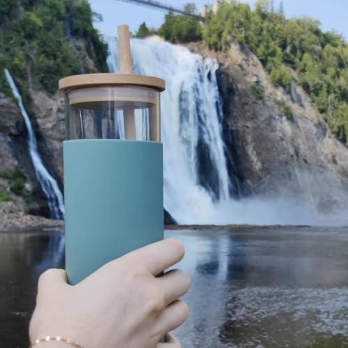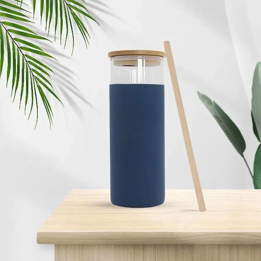 Generic - كوب زجاج معزول مع غطاء من الخيزران، 500 مل، أزرق كحلي، حاوية للمشروبات الساخنة والباردة، شفاطة قابلة لإعادة الاستخدام